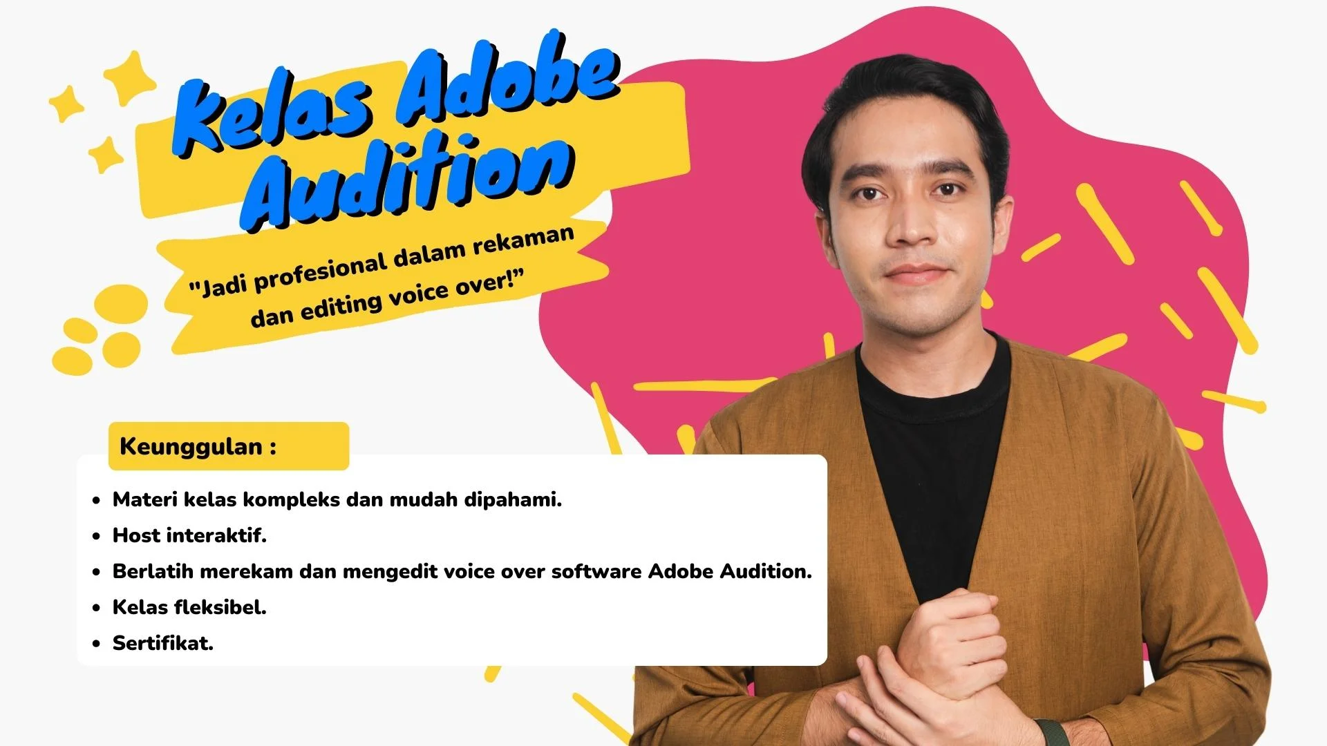 Salah satu pondasi yang harus kamu punya sebagai seorang voice over talent adalah memiliki skill editing audio. Dengan memiliki skill editing yang mumpuni, peluang audio kamu untuk dilirik klien akan semakin banyak. Dengan mengikuti Kelas Adobe Audition dari Indovoiceover Academy, kamu bisa mempelajari cara mengedit audio dengan software Adobe Audition. Kamu akan mulai belajar dari dasar-dasar editing audio dan mengenal fitur apa saja yang harus digunakan untuk mengedit audio. Kamu juga akan belajar cara menggunakan fitur-fiturnya agar audio kamu teredengar lebih baik. Kelas ini sangat membantu untuk membuat rekaman suara yang berkualitas. Segera tingkatkan keterampilan editing kamu dengan bergabung di Kelas Adobe Audition dari Indovoiceover Academy. Perlihatkan suara emasmu!
